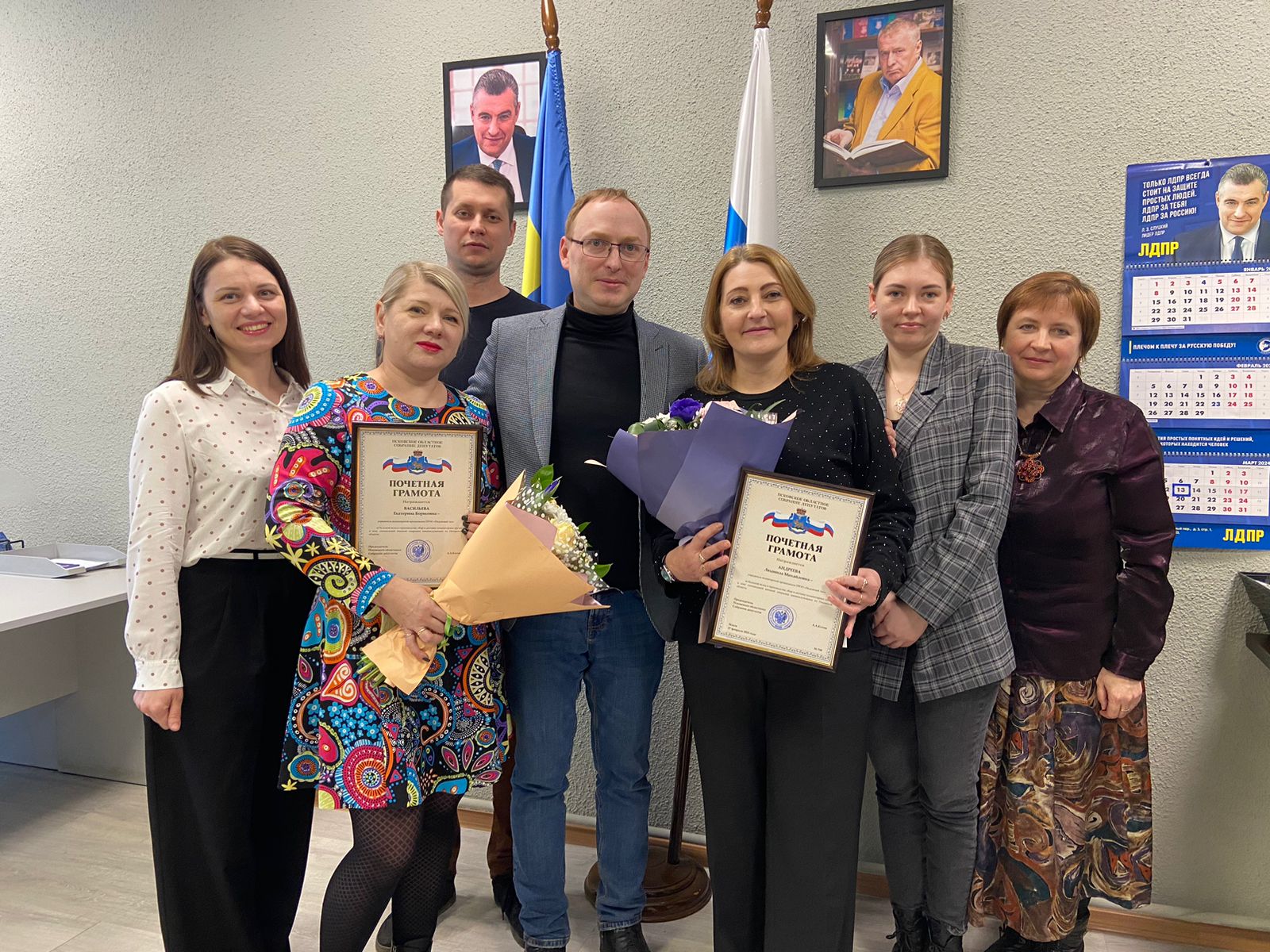 Почетные грамоты и букеты живых цветов учредителям волонтерской организации ПРОО «Надежный тыл» вручил депутат областного Собрания от ЛДПР Антон Минаков.