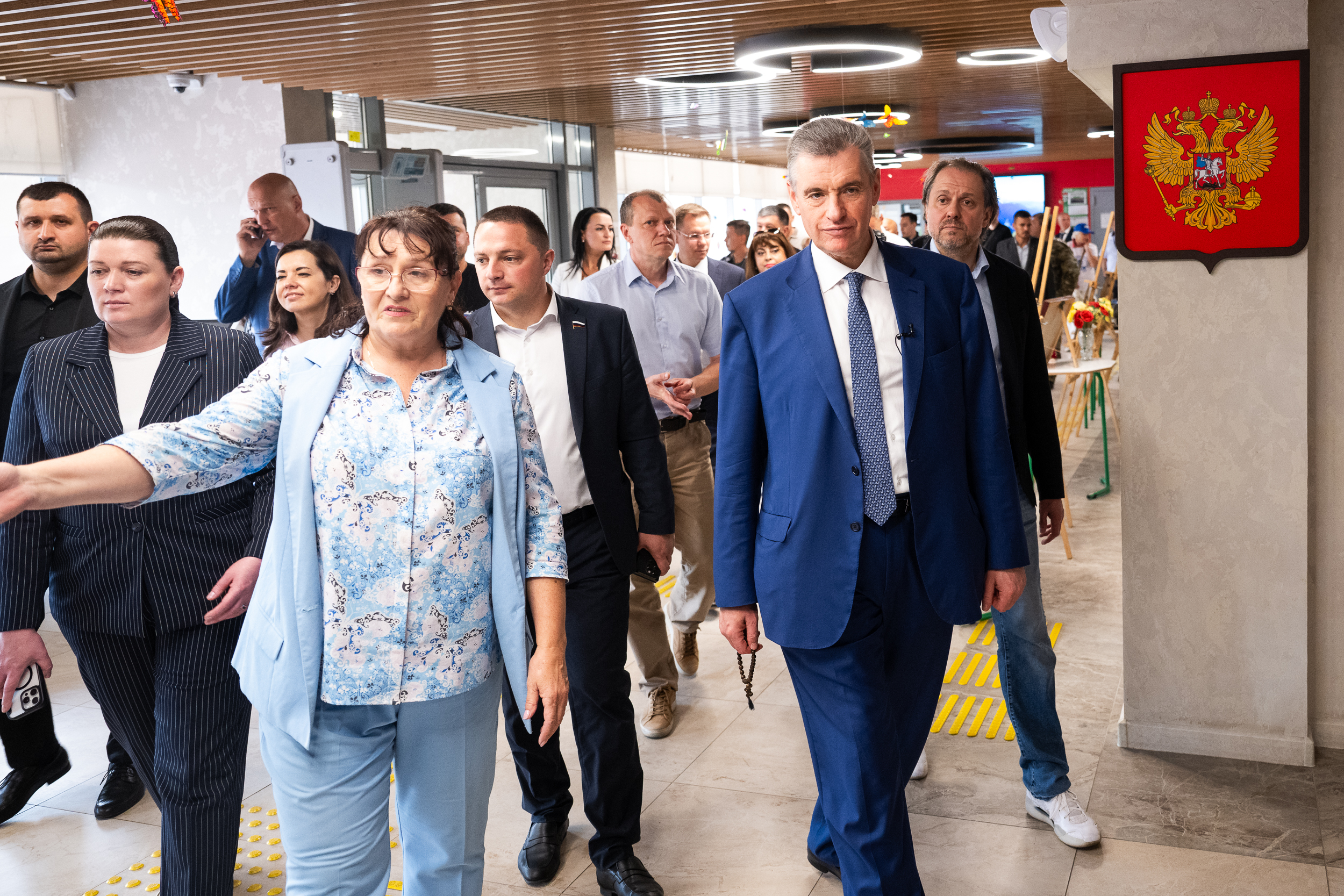 Леонид Слуцкий поблагодарил педагогов и его директора Ларису Акуленко за кропотливую работу по восстановлению центра, встретился с родителями воспитанников учреждения, посетил тренировку секции по художественной гимнастике, посмотрел репетицию детской театральной студии и выступления творческих коллективов.
