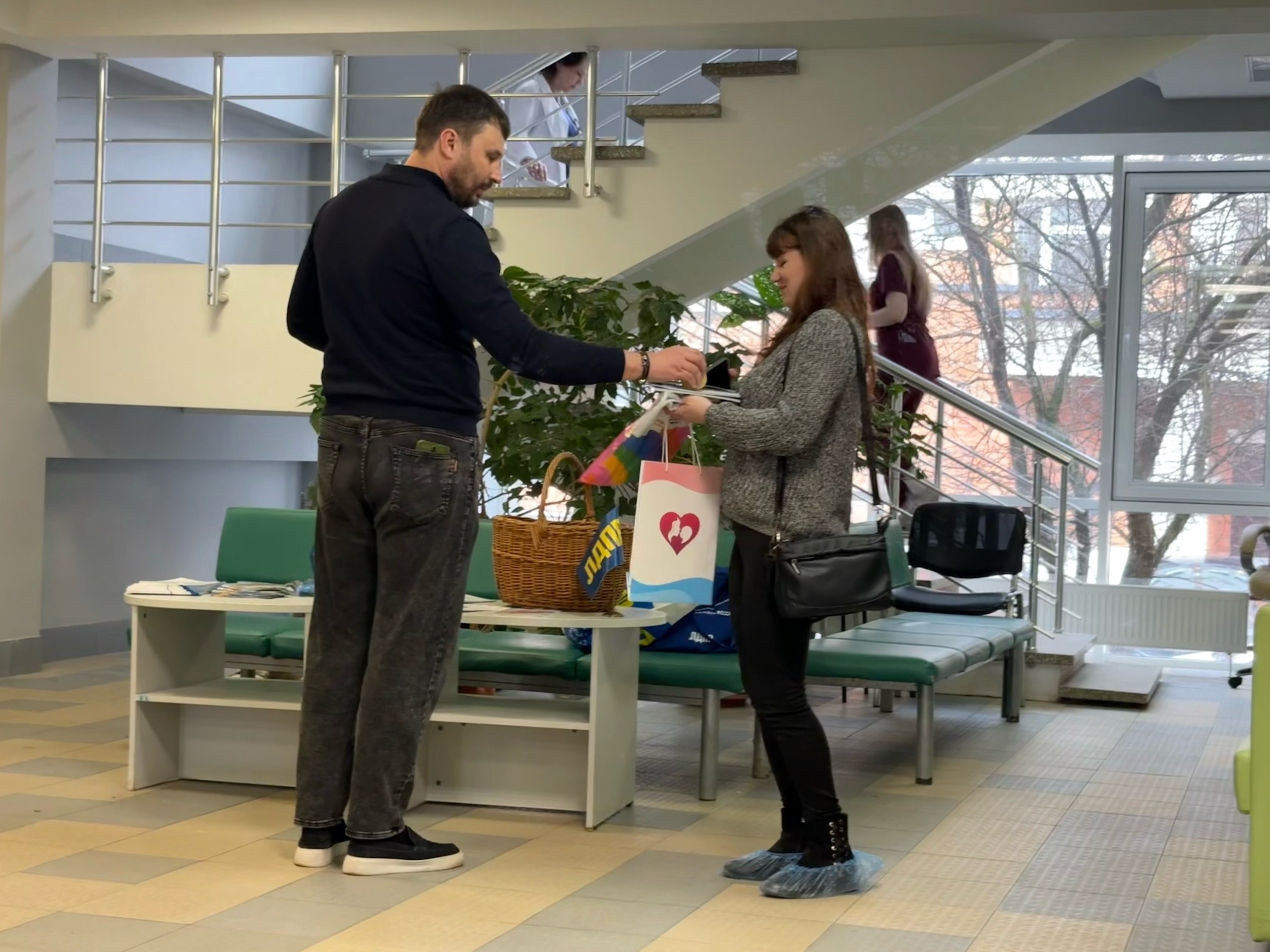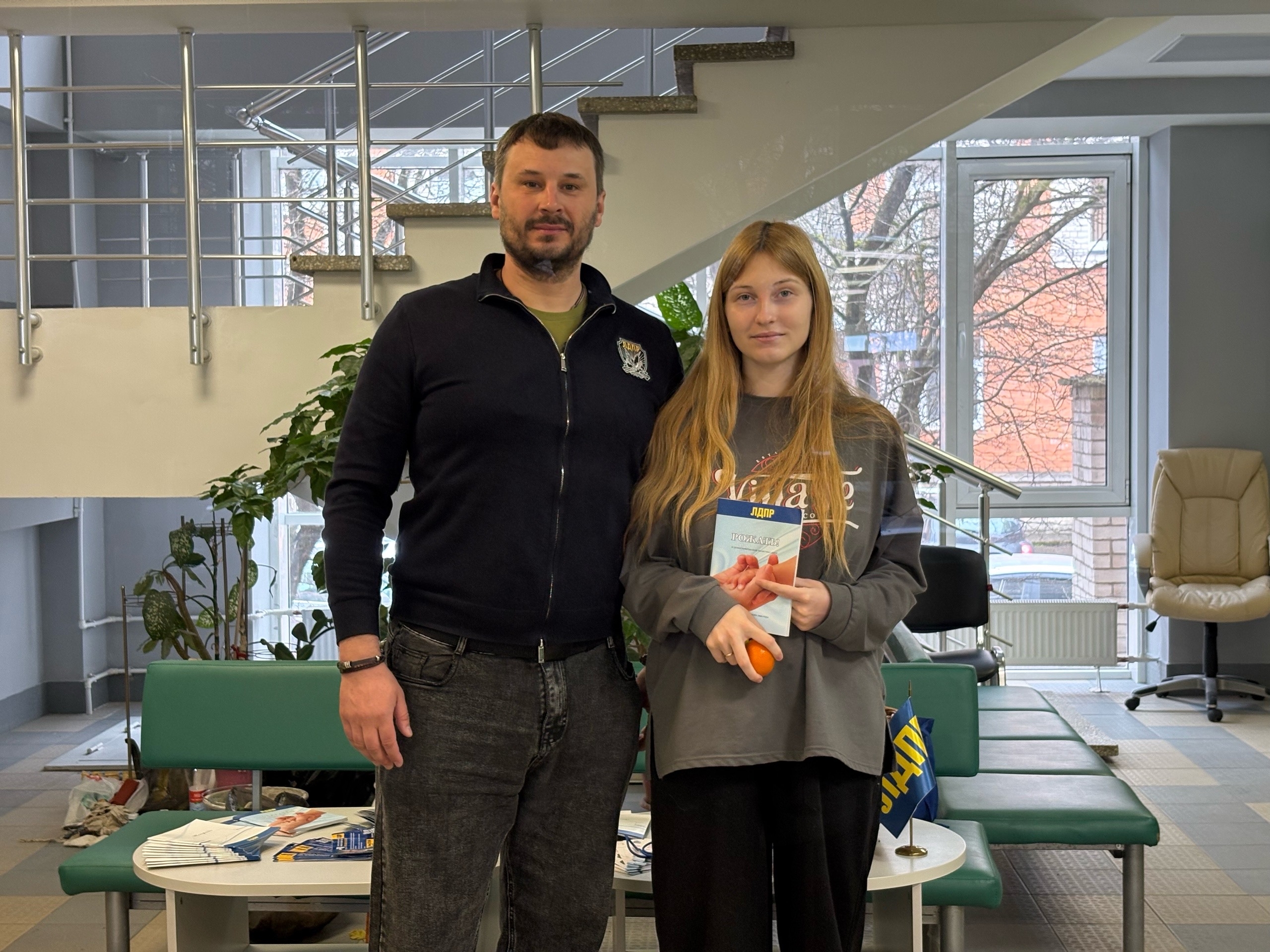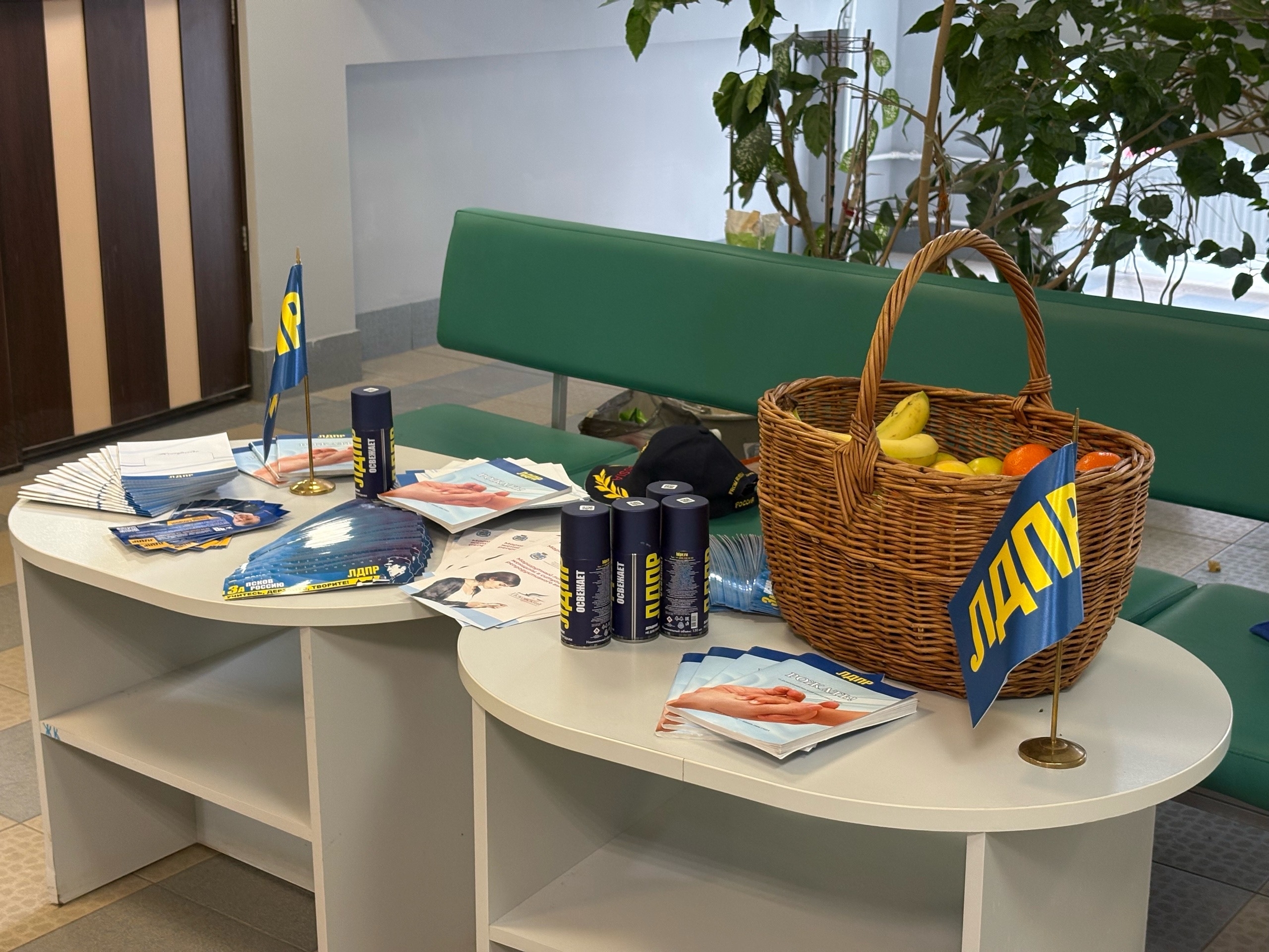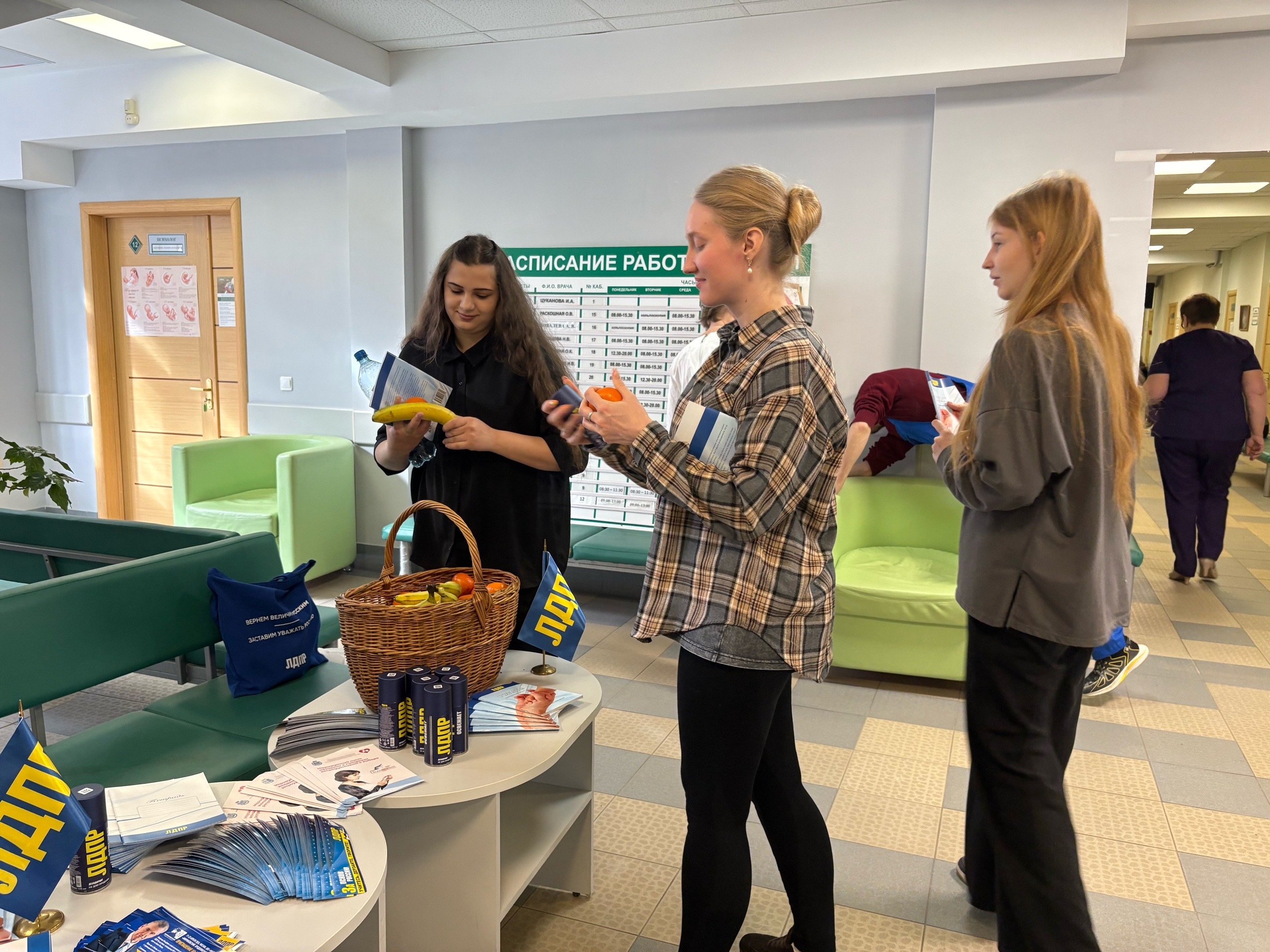 В главном холле перинатального центра для будущих мам активисты партии организовали витаминный стол, на котором девушки могли взять полезные фрукты, а также атрибутику с символикой ЛДПР.