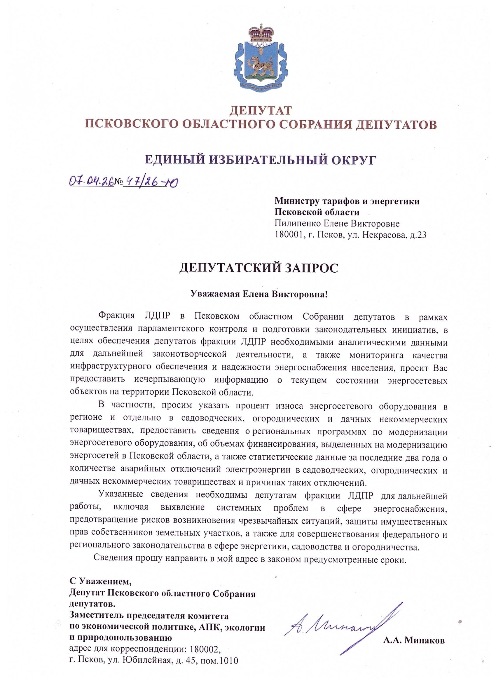Депутат Псковского областного Собрания Антон Минаков направил запрос на имя министра тарифов и энергетики Псковской области с просьбой предоставить информацию о состоянии электросетевых объектов на территории региона.